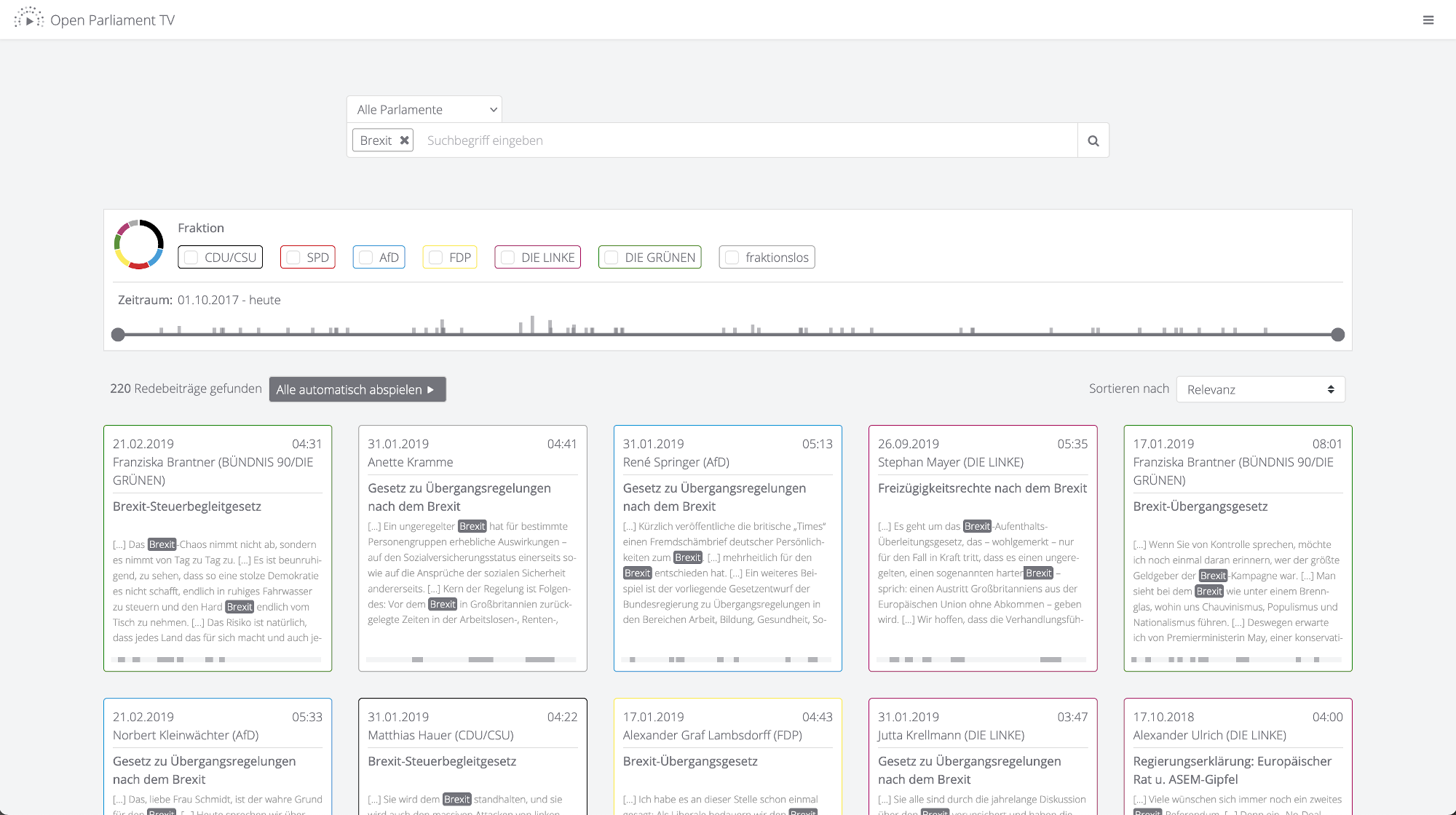 Mit Open Parliament TV können Videoclips von Bundestagsdebatten über eine Stichwort-Suche gefunden werden. Für Suchanfragen eignen sich spezifische Themen wie „Klimawandel“ (514 Redebeiträge), aber auch alle Formulierungen wie „es ist die Wahrheit“ (161 Redebeiträge).