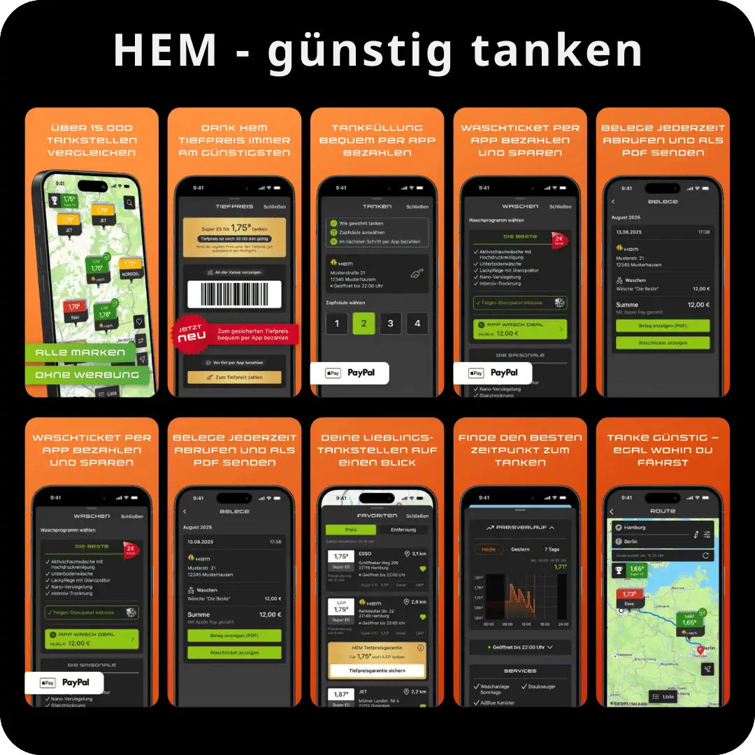 Besonderheit: ergänzend wirbt der Anbieter mit einer Tiefpreisgarantie. Sollte im Umkreis von fünf Kilometern um eine HEM-Tankstelle ein günstigerer Preis verfügbar sein, stellt die App einen entsprechenden Coupon bereit. Die Preisabfrage erfolgt laufend aktualisiert und lässt sich für bevorzugte Tankstellen speichern.
